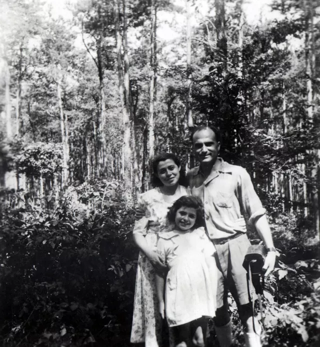This is my family: Pepo Kohen, my husband, Leah Kohen-Ausburger, my daughter, and me at a picnic. The photo was probably taken in 1945-46 since my son Valeri had not yet been born. I can't tell the story of this particular picnic, but our family used to go to Vitosha Mountain, every opportunity we had.