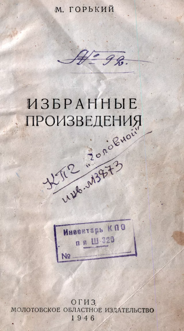 This is the title sheet from a book by Gorky from the library in the camp in Nyrob settlement, Perm region. I read aloud from it to the prisoners in 1952. They wrote it off from the library assets in the same year and I was allowed to take it. There is a stamp of the cultural and political department on it. I've kept it since then.