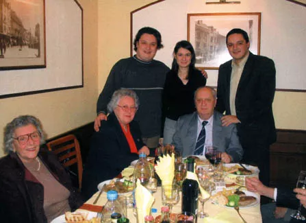Here you can see my husband Tosho [diminutive from Todor] at his 80th birthday party, together with my grandchildren. We are in a restaurant in Plovdiv. Standing on the left is Victor, hugging his fiancee Eva Mashiyah. On the right is Robert. Tosho and I are sitting in front of them. The year is 2005.