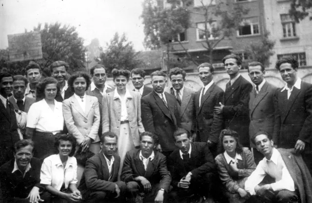 This is a picture, taken on a national holiday, of me with my classmates and literature teacher from the evening school where I studied after the war. I studied at the same time that I started to work in the Osvobozhdenie factory.