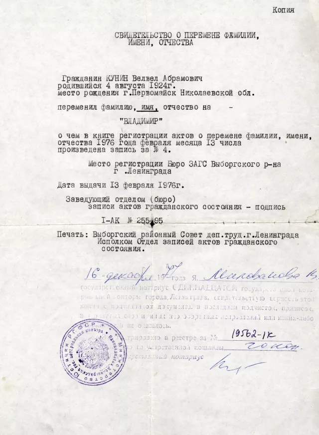 In January 1961 our son Leonid was born. Now he lives in Petersburg, he married a Russian woman, but they don’t have children together. I gave birth to Leonid at the age of 31. When Lenya grew up, I asked my husband to change his name from Velvel to Vladimir, as my son needed to receive a passport, but with such a patronymic –Leonid Velvelovich – at that time he wouldn’t have been taken into the Military Institute, which was his dream when he was 16 years old. But then he was taken in with the patronymic Leonid Vladimirovich.