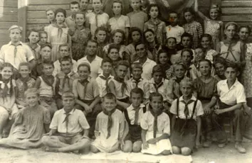 This is me in the pioneer camp for the children of cultural workers. I am in the 2nd row, the 6th on the left. The photo was made in Odessa in 1946. We were photographed at the end of our summer vacations.