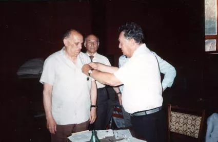 The picture was made in Moscow on the 9th of May, 2001 in the presidium of the Council of Jewish War Veterans. The citizen of Israel (unfortunately, I do not remember his name), the member of Israeli WW2 Veteran Community is giving me a badge. I am to the left.