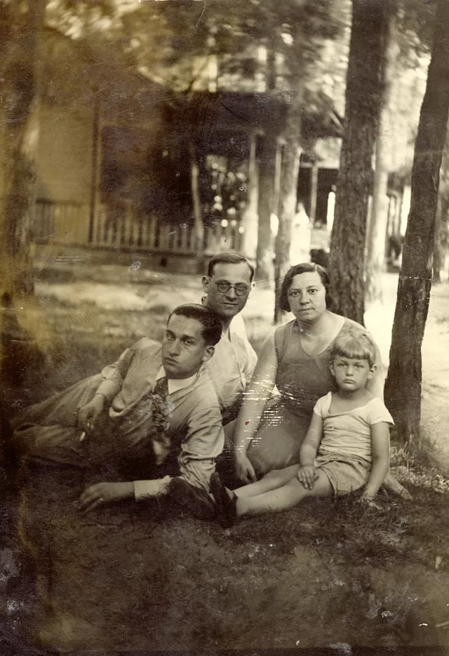 This is me, my dad, Szlomo Kornblum, my stepmom Lonia and Beniek Tygiel, Lonia’s nephew on our first vacation together in Miedzeszyn, in 1931. My little brother Borus wasn’t born yet. I think this was my first photography ever. It was sent to Paris and there it survived the war and came back here. And there’s a dedication on the backside. Written by Stefa, my cousin, to Mania, her aunt: ‘On this picture, as you recognize, there’s Lonia, her husband, who you supposedly dream of (Is he similar?), and our Beniek - you can see how adult is he. And this charming kid is the little son of Lonia’s husband.’