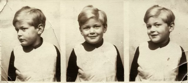 This is my triple photo. This photo was sent to my uncle Mosze who was in the United States. That’s how it survived the war. On the backside there’s a dedecation: ‘Anu feter. Vi gefel ikh dir? Ikh bin avoyler ziser bukher un ikh ken vershidene kinzen. Far mayn feter Moyshe, Izyo Kornblum.’ - ‘To my uncle. Do you like how I look? I’m such a sweet boy and I can do different tricks. For my uncle Mosze, Izio Kornblum’