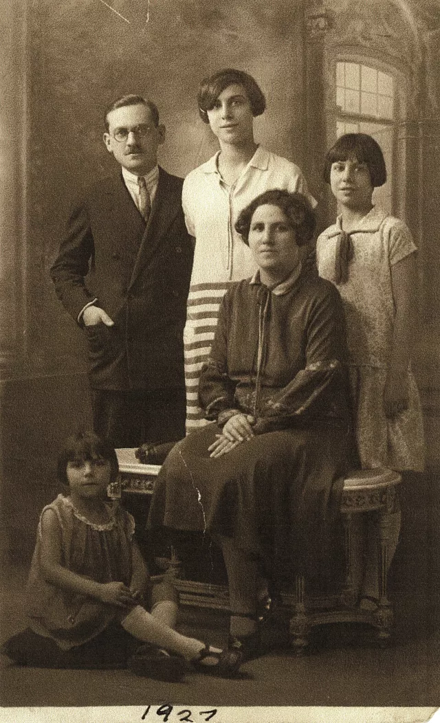 This is my father Szlomo Kornblum with his brother Mosze’s wife and their daughters. The uncle’s wife, who’s name I don’t remember, is sitting on the chair. On the floor sits my cousin Lilian, who’s still alive and near to my father are Madelaine and Suzanne. This picture was taken in 1927, most likely in Paris.