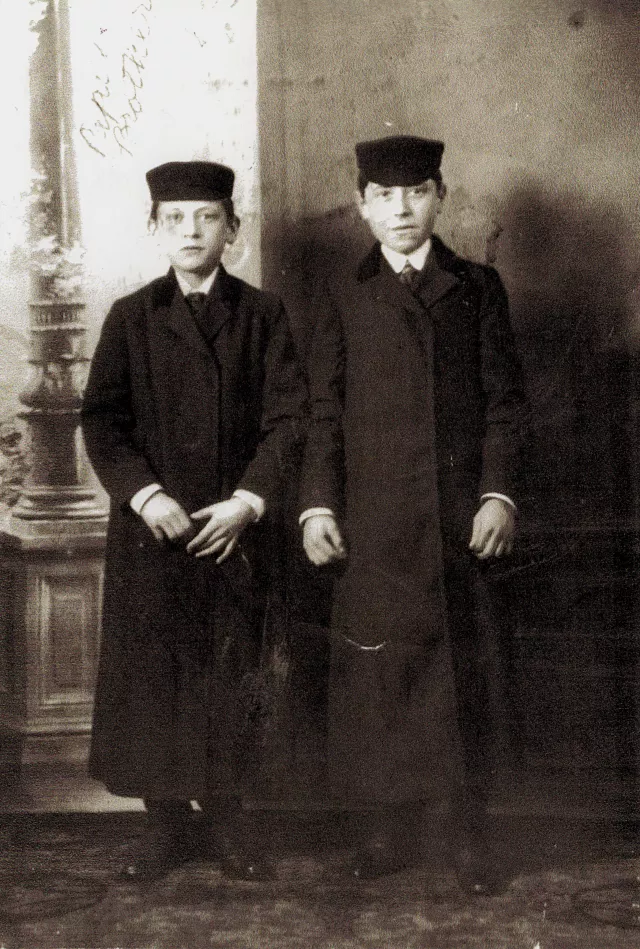 This is the picture of my father Szlomo Kornblum with his brother Mosze, still in the traditional Jewish costumes. As far as I know it was taken on my father’s bar mitzvah, so he is 13 years old here.