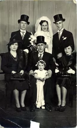 This is a photo of the wedding of my cousin Ceni. Ceni is the bride standing at the back, in the center of the photo. On the very left you can see my mother’s sister, my aunt Rasel Beraha. Beside her is her husband whose first name I can’t remember. They are marrying their daughter Ceni that day. Behind my aunt Rasel, stands her son, Ceni’s brother, and the lady sitting in the fron row on the right is his wife. The little girl Mr. Beraha is holding is the daughter of this latter couple.