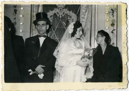 This is my wedding picture. My deceased husband, myself and my mother. My mother was a well-dressed woman. My wedding gown is ready made crepe-satin, bought from Eliya Pardo. The hairdresser Cevdet had done my hair. A simple wedding.