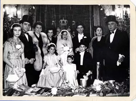 The other people in the photograph: Starting on the right, my father, my mother, myself, my wife, my mother-in-law, an aunt of my wife, Suzan Kazes and her husband Alber Kazes, and the daughter of Suzan Kazes, Dolly Kazes, (today Dolly Levis), in front the little grooms and brides: on the right my nephew Albert Tabah, next to him, his sister Marsel Tabah and on the left the daughter of a relative of my wife’s, I do not remember the name.