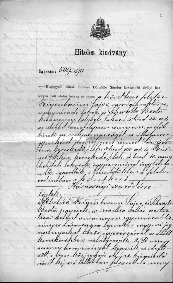 My father's mother was called Berta Schwartz. She was born in Kecskemet around 1860. She went to grade-school there. She finished 6 grades. First she lived in Nagyvarad [now Oradea, Romania] then in Marosvasarhely [now Tirgu Mures, Romania]. She went there with my grandfather because that's where one of my grandfather's cousins - Vilmos Feiglbaum - lived. He had the biggest colonial goods trade in Transylvania, and he had no children. And he wanted to leave the business to my father. In the end he closed the business and bought a little one-floor house, and my grandmother, who was a widow by then, went there to take care of her beloved in-law, who was blind.