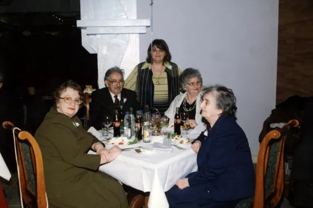 My sister Matilda Melnik and I are sitting one opposite the other at the table. She now lives in Houston, USA. The Nissim family and Stela Maier are sitting at the other end of the table. They are Sima Yulzari's parents, my son Sinto Yulzari's wife. Behind them, standing, is my oldest granddaughter, Irena Cestnik, the daughter of my daughter Buena Cestnik, nee Yulzari. Irena works as a teacher in Ivrit at the Jewish school in Sofia.