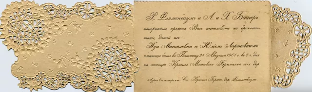 This is an invitation letter to the wedding of my paternal grandfather Yuli Baicher and grandmother Ida Fliamenbaum. Their wedding took place in Krasnoye station in 1901.