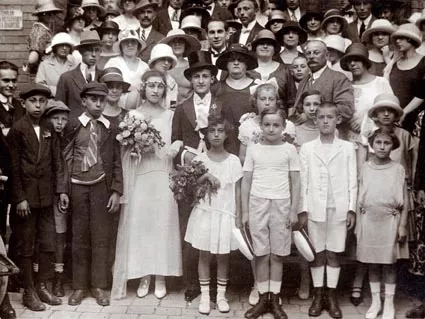 The wedding picture of my parents, Istvan Kauders and Rozsa Freiberger in 1924. Location - in front of the Dohany Street Synagogue. A wedding in the temple was very expensive, my parents wouldn't have had the money for it. My mother got herself together, went to the cheif rabbi, Simon Hevesi, and told him that she was a poor girl, but she'd like to be married here for free. She succeeded.
