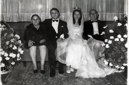 Erna and I (Nesim Alkabes) had three daughters from our union. Our oldest daughter Sara was born in 1948, Rosita in 1950, Stella in 1954. All three of our daughters attended elementary school in Isik Lisesi. Sara and Stella finished Saint Benoit French highschool later on. Rosita, on the other hand, graduated from Robert College. After completing their education, our oldest daughter Sara, married Erol Penso following 8 years of dating, on March 29th, 1970, in Neve Shalom. This photograph is of that day, in the picture, second from right is our 22 year old daughter Sara, to her left our son-in-law Erol, to his left his paternal grandmother and to the right of my daughter, the father of Erol, Mr. Jak is seated. This gentleman is from Çanakkkale, after completing his education they came to Istanbul to settle.
