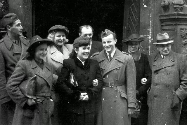 This is a picture from the wedding of my cousin Pavel Stransky, taken in Prague in 1946. From right to left: my uncle Leo Kovanic and his wife Polina Kovanicova, Pavel with his wife and me.