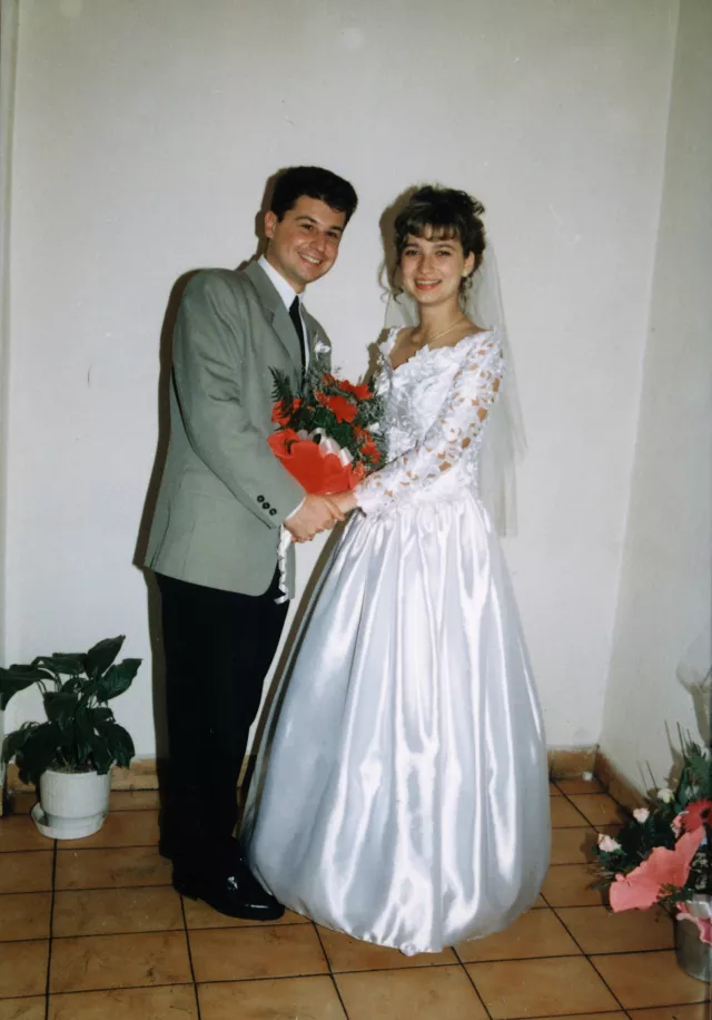 This is a wedding photo of my grandson Lyubomir Punchev, son of my daughter Streya Puncheva (nee Alhalel) and Ignat Punchev. It was taken in Sofia in the 1990s. At that time they both worked in Bulbank in Sofia. They both have degrees in finance. Daniela graduated after the marriage and Lyubomir was appointed director of the branch of Bulbank in Vidin. Now he is one of the directors of Bulbank in Sofia. Lyubomir has two children. Their names are Konstantin and Mihaela and they live in Sofia.