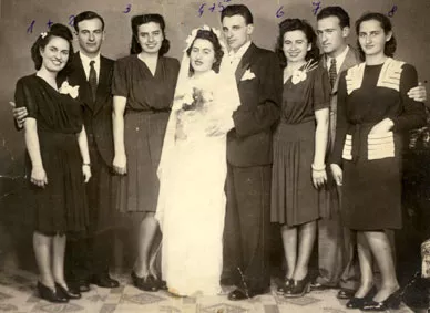 This is the wedding photo of Margit Fisch, nee Mandel, who was the sister of my husband’s first wife Anna Grossmann [nee Mandel]. The persons on the photo starting from the left: the persons marked with one and two are Sanyi Fisch and his wife, I don’t know who the third is, the fourth is Margit Mandel, the bride, the person with a five is Erno Fisch, the groom, the sixth is R. Fisch, the seventh is Hersi Mandel, the eights is Annus Grossmann.