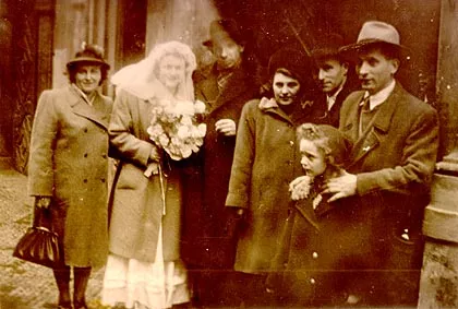 This is a picture of my wedding day, taken in Prague in 1947. My aunt from Prague, Etus is holding my arm. On the other side, my husband Hermann Deutsch has taken my other arm. My father 's second wife, Sarika Schiffer is beside him, then comes my father. In the foreground is Nachman Tevlovits, my aunt's husband, and Jindricka, their little girl.