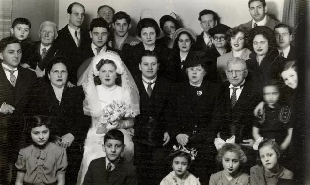 On the second row you can see from left to right: my father-in-law, Hayim Baruh, my mother-in-law Rebeka Baruh, the bride Bulisa Baruh, me, the groom, my mother Mazalto Coyas, my uncle Jozef Deleon, my aunt Rasel Deleon’s husband.