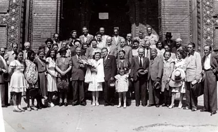 At my older sister Klari's wedding on June 5, 1945. The picture was taken in front of the Dohany Street synagogue. In the first row, fifth from the right, is my uncle Imre Kauders, the sixth is the father of the groom, the seventh is the mother of the groom and in front of her is the groom's niece. In the first row, first from the left is me, the second is my mother and the third is my father.