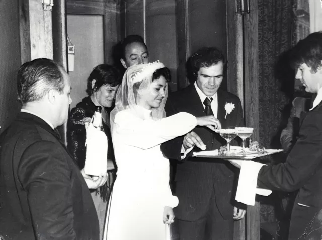 This is the wedding of my younger daughter Sheli Mayer Vladeva (nee Alhalel) in 1976 in Sofia. Her husband's name is Vladimir Vladev, a colleague of hers from the university, construction worker like her. They are in the center of the photo. Behind them are their sponsors Ester and Jak Fintsi (my sister and her husband). The two men in the foreground on the left and on the right, holding glasses and a bottle of champagne are the waiters in the restaurant where we celebrated the wedding.