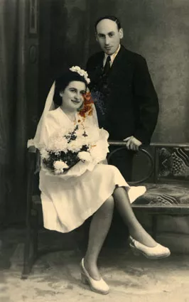 This is Sifra on the left, a sister of my wife, with her husband, Simca, on the right, when they got married. They married before us, in 1945. Sifra adopted a Romanian name at a certain point, they called her Aura. This eldest sister was born in 1921. She attended the Commercial High School, then she went to the Faculty of Law. She worked in Bucharest in the field of journalism. Simca worked as an expert accountant. They left to Israel 20 years ago and have a 58-year-old daughter who is already a grandmother.