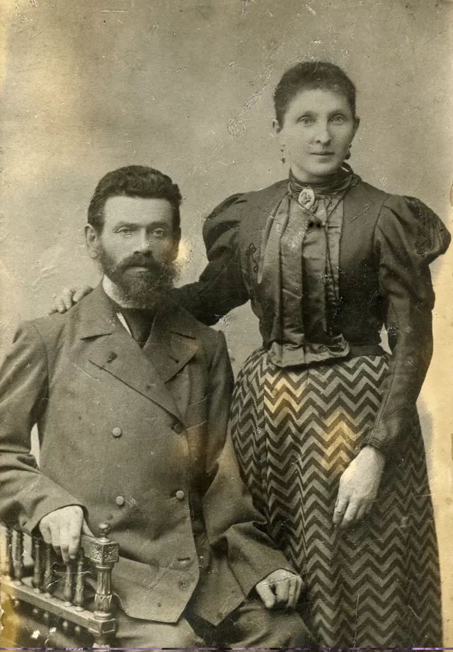 This picture was taken in Saratov in the 1880s. These are my paternal grandparents, Yakov and Genessa Tseitlin. They are apparently dressed up for the occasion.