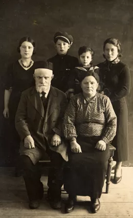 This is our family. My maternal grandfather Mende Ril is sitting to the left, grandmother Golda Ril is next to him. From left to right standing: their younger daughter Ginda, I, in a kap, my sister Genya, to the right is my mother Taube Bunke. The picture was made in Plunge in 1930s in Plunge.