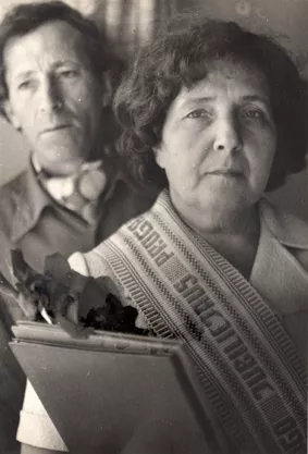 This is my wife Dalya and I during celebration of her 55th jubilee and retirement. She has worked in Ispolkom all her life and hundreds of her colleagues gave her presents and told her many warm words . The picture was made in Plunge, 1980.