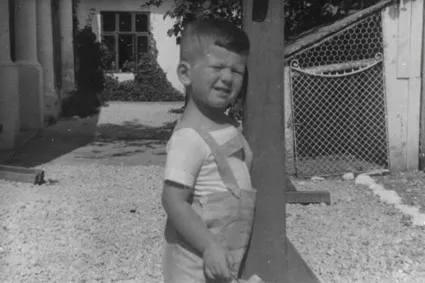 This is a photo of me, Ladislav Urban in the yard of our house in Piestany in 1937. Behind me is a small fenced-in chicken coop, where we had a few chickens. The building where we lived had been finished in 1842. I know this because a few years ago we found a cast-iron plaque walled-up there that said this. Our apartment was upstairs, and downstairs my father had his textile store. We always had running water as well as electricity. The building belonged to our family. The store is there to this day. We recently enlarge the building. We added another floor. Currently some of the space is being rented to the companies Allianz and Home Credit. During my youth, there was a warehouse behind my father's textile store, and then a tailor's shop, where Mr. Goldsteinova sewed; later she changed her name to Galova. Mrs. Goldsteinova sewed custom shirts and men's underwear. Her daughter graduated from medical school, and after the war worked as a doctor.