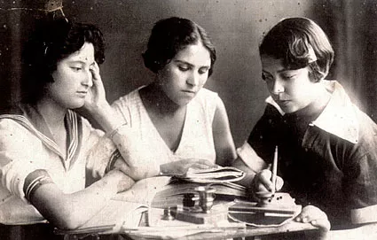 I, Yelizaveta Zatkovetskaya, from the left, with my friends, students of the Jewish Faculty of Kiev Pedagogical College named after Schmidt, photographed in our room. This photo was made in Kiev in 1934.