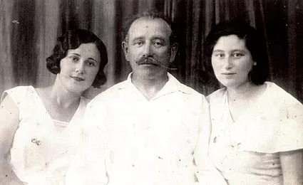 In this photograph is my uncle Zalman Miller (in the center) photographed with me, Yelizaveta Zatkovetskaya, (I am from the right) and my friend Fira, an assistant doctor at the '17th district', when I was working my mandatory job assignment as a teacher after finishing college. This photograph was made, when my uncle visited me and met my husband to be Peretz Freidkin. This photo was made in 1936.
