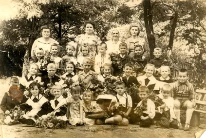 Children in the kindergarten in Bershad where my sons went: my older son is the boy in the center wearing a light color suit. This photo was taken in Bershad in 1957.