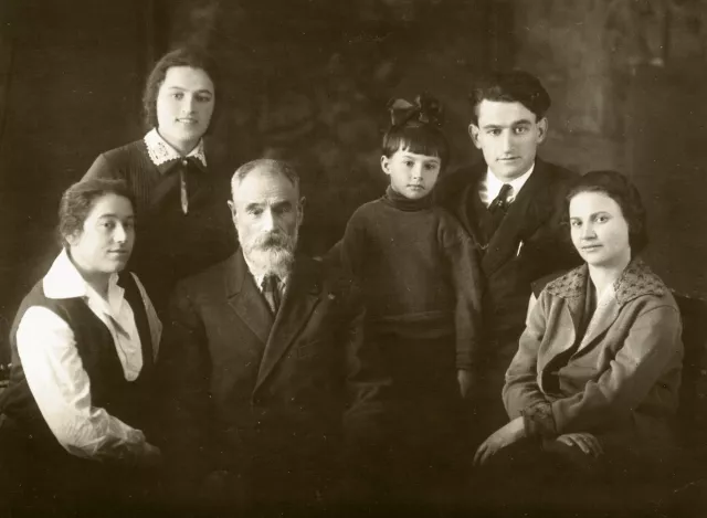 From left to right: my aunt Dina Kogan (nee Bograd), my aunt Revekka Sadikova (nee Bograd), my grandfather Yitzhak Bograd, my cousin Vladilena Bograd (Yefim Bograd's daughter), my uncle Yefim Bograd, and his wife Raisa Bograd. My father kept this photograph.