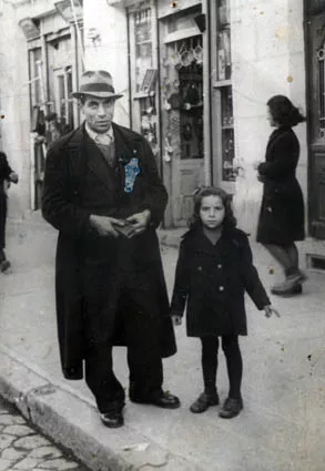 In this photo you can see my uncle Yosif – my mother Liza’s brother – and my sister Viky. They were photographed in a street in Plovdiv but I can’t say which that street was. There is an inscription in ink on the back of the photo: ‘Plovdiv, 17th November 1943’. There follows another inscription in pen that was obviously done in later years that says: VIKY. There is no stamp of a photo shop. My uncle Yosif used to live in Sofia but during the Holocaust he was interned to Plovdiv. There is an ink stain on his lapel. My sister Viky had erased with ink the badge that was obligatory for us at that time.