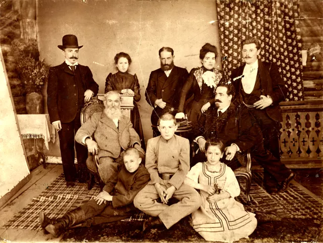 I guess it is my grandfather's younger brother Grigori Baicher sitting between the two armchairs in the center. I don’t know the other relatives on this photo. This photograph was taken in Moscow sometime between 1895-1897.