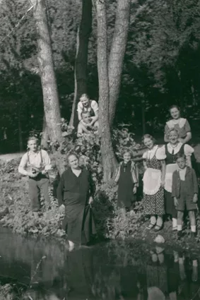 This photograph was taken around 1935 at Zelezna Studnicka [Steel Pond]. I, Henrich, am at the far right. I don't recognize the other people in the photo. There isn't anyone from our family among them. As you can see, the women are dressed in German outfits. Already, back then, the events in Germany were making themselves felt where we lived.