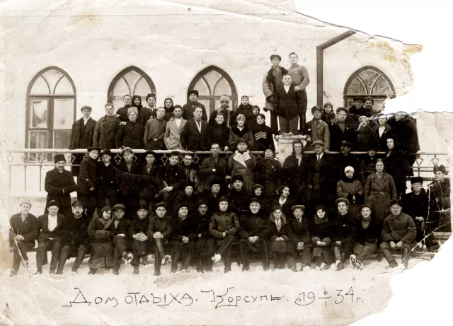 This is my father Moisey Leibovich at a recreation center, standing in a group of young people. He is the tallest one, wearing a white shirt and a black jacket. This photo was made in the town of Korsun in 1934.