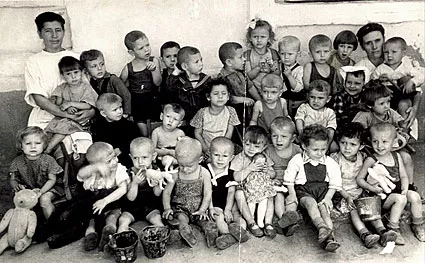 This is the kindergarten where our older son went. Igor Rukinglaz, wearing and sailor's suit in the upper row. This photo was taken in Kherson in the early 1950s.