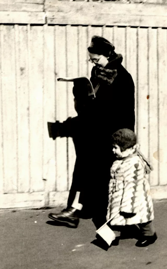 My wife Zoria [Hotinskaya, nee Petrunicheva] with our daughter Nina. This photo demonstrates their characters best of all: my wife, reading everything and always and my Nina firmly holding her Mom's hand.