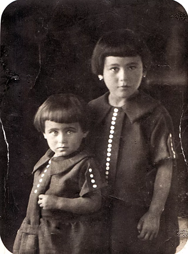 This is me and my one-year-old sister, Judit, in 1924. We were the two children. Our mother, Margit, was born in 1890 into a big family - she had 10 brothers and sisters. Her family was quite religious. Her father had two kosher butcher shops in Obuda. She married my father, Lipot Maszler, in 1920. He had been married before, but his wife died in childbirth in 1916. They moved to Pilisvorosvar and lived in the house my father inherited from his parents. My father worked as a business agent for the local coal mine. He went to synagogue every Friday, but on Saturdays he had to work. If he was free on Saturday, he went to shul and took us along. My mother made challah on Friday and she taught us how to light the Sabbath candles and what blessings to say. I still remember some of them. Judit and I went to the local elementary school. It was a mixed school, with Jews and Gentiles alike.