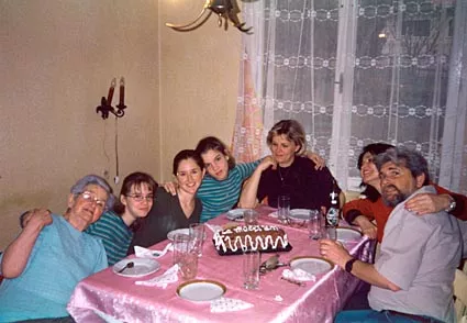 This picture was taken on 24th April 2003, on the occasion of my son Peter's family visiting me here, but it was a birthday, as well. you can see the festive meal. We were celebrating my son Peter's 55th and my daughter-in-law Zsuzsi's 46th birthday, who was Gyuri's wife. On the right, the first man is Peter, next to him his wife Angela, at the upper end of the table that's Zsuzsi, next to her that's her younger daughter Judit, in the center that's Peter's daughter Andrea, and next to her Zsuzsi's elder daughter Kati and myself. My son Gyuri took this picture. It was taken in the smaller room of my apartment, it was originally the children's room. It was very nice. I cooked the birthday cake, of course, but they were already ate quite enough so they didn't touch it. I was very happy. Unfortunately I don't know whether they will come this year or not, but I hope they will...