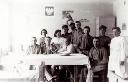 This is a photo from military hospital in Lublin, where I worked in 1944 as a nurse. I am standing second from left. The men around me are maily our patients. I don’t remember their names.