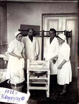 The hospital in Kemerovo was located in school buildings. It was large, consisted of two buildings. We only had one real surgeon, the rest were general practitioners. Everybody was retraining back then. I was told to put plaster casts. In Poland casts were applied by doctors and in Russia it was done by technicians. There was this girl in Kemerov, a very good plaster technician. Because there were two buildings they decided to create a second casting room and to put me in charge of it. I didn't have a clue about it but the girl taught me everything. To help me I was assigned a cleaning girl, Marusia, and a medical orderly who knew as much as I did. But I did learn and the quality of my casts was never questioned. It was a very tough work. Whole transports of wounded soldiers kept coming from the frontline, we had to remove all those pus-covered casts. They came all dirty, infested with lice. Whenever a train with the wounded came the personnel didn't sleep for a few days straight, until we brought them back to normal.