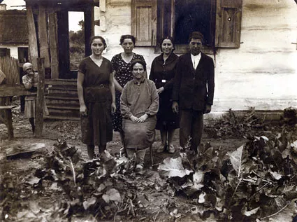 This is my uncle Motel’s family. He’s never allowed to take him photos, because he was an orthodox Jew. In the center is sitting his wife, aunt Perl and behind her are standing their daughters: Zlata, Hinda and Bala. It is their house in Skryhiczyn.
