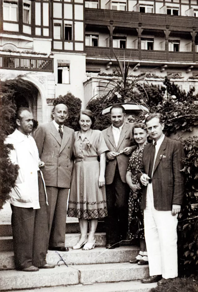 This is Zygmunt Minc, my father’s brother, in front of a guesthouse, surrounded by friends..