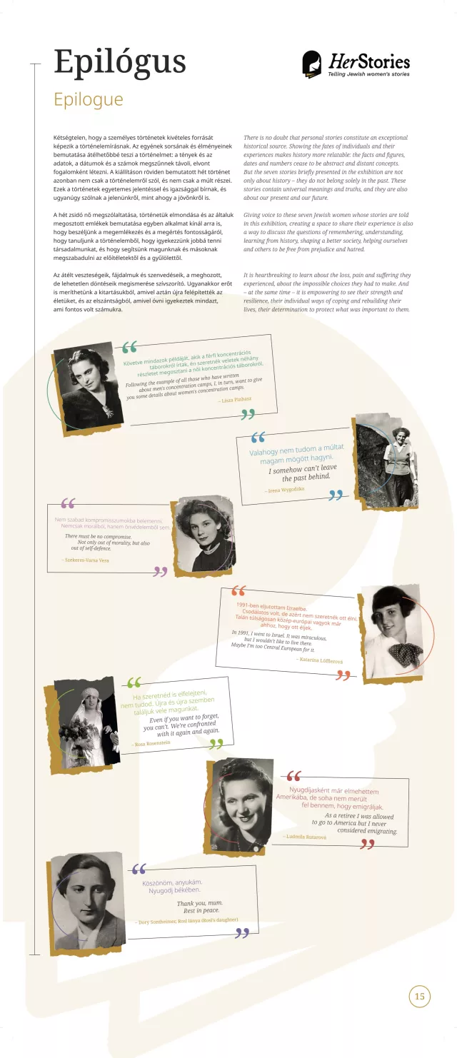 A történetek nem csak az üldöztetés, a deportálás és a menekülés megéléséről szólnak, hanem a túlélésről, a holokauszt és a II. világháború utáni újjáépítésről is. A kiállítást bejárva megtudhatjuk, hogy milyen volt zsidó családban felnőni a háború előtt, a visszaemlékezésekben felelevenednek szerelemek, iskolai élmények, mindennapi remények és küzdelmek.