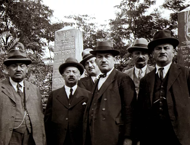 Ez apám a testvéreivel Felpécen a zsidó temetőben a szülei sírjánál. A kép 1933-ban készült, ugyanakkor, mint az, ahol a szülői ház előtt állnak. Nem gyakran jöttek össze a testvérek (Béla például Bécsben élt), de amikor összejöttek, mindig kimentek a szüleik sírjához. József, a legidősebb áll bal oldalon. Mellette Sándor, aztán apám, Lajos, és jobbra János. Mögöttük áll Béla.