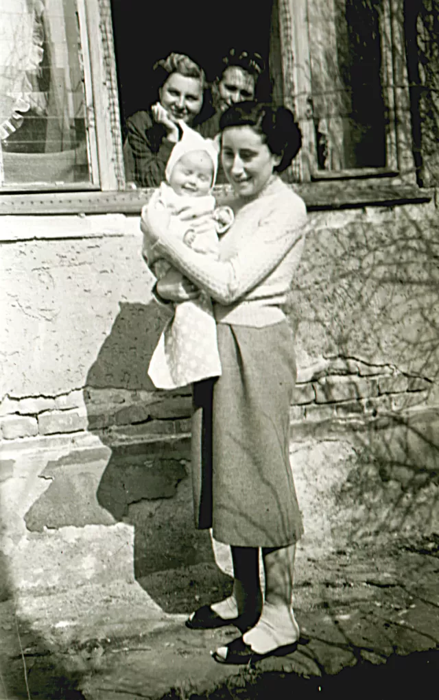 Itt Márti unokámat tartja Judit lányom a kezében, hátul én vagyok, azt hiszem, és mellettem lehet, hogy a Judit férje. Mátyásföldön készült a kép, 1956 körül. A Márti 1955-ben született. Az én szobám ablaka alatt állnak. Valószínűleg Márti anyja, Marika készítette a képet. Marika szeretett fényképezni.